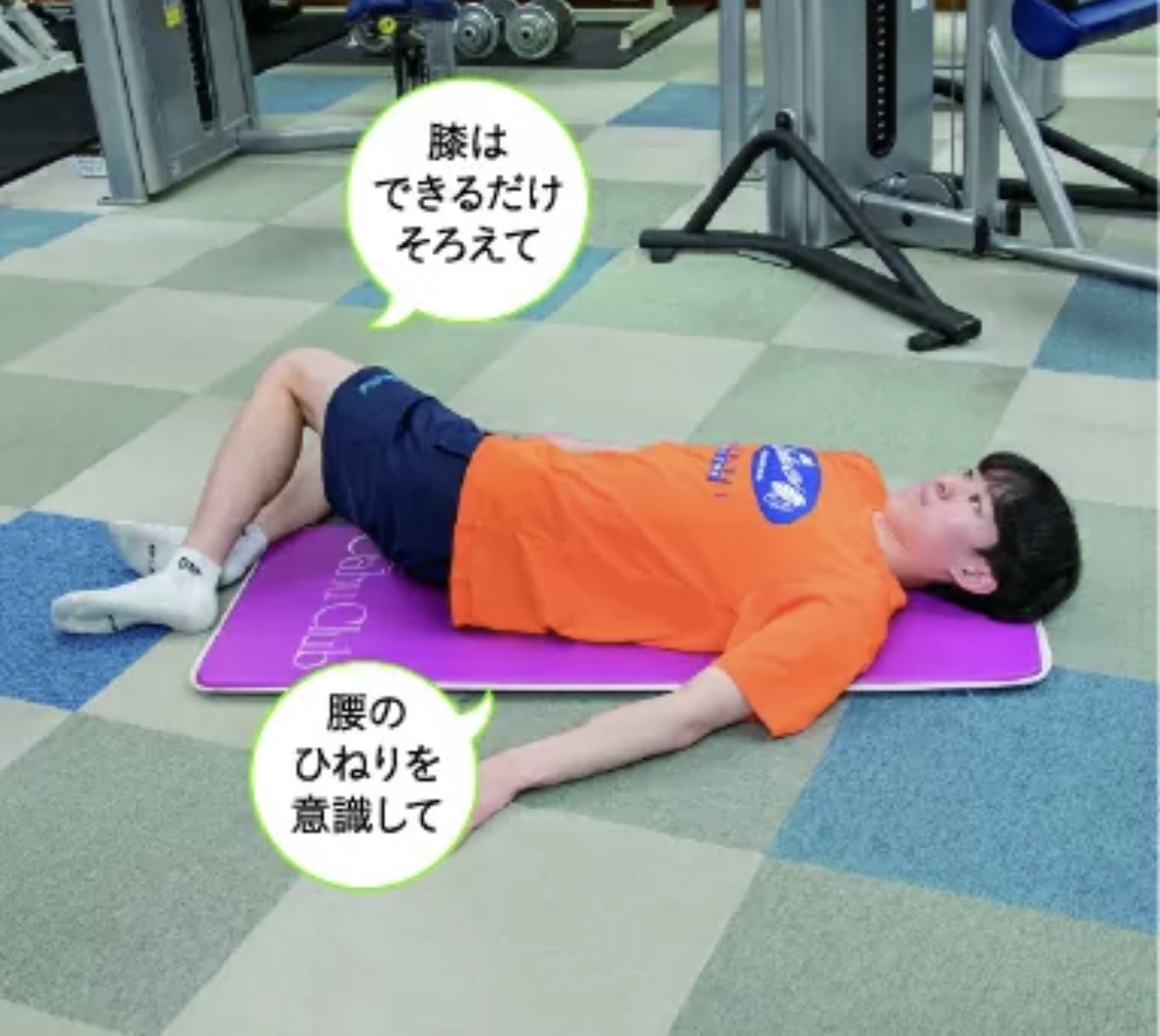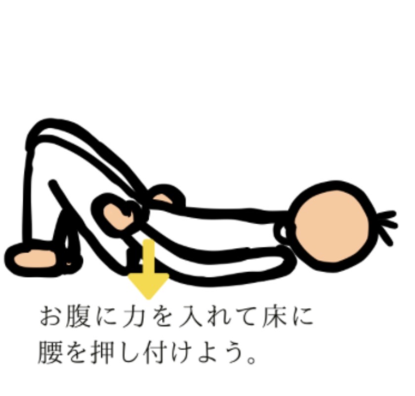 ・お腹を軽くへこませて腰をゆかに近づけて5秒キープ