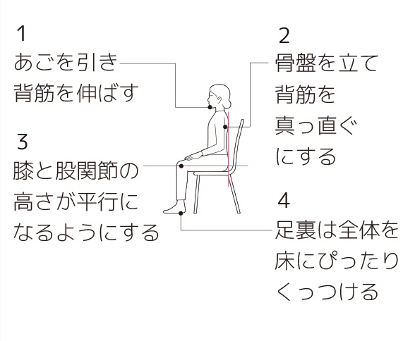 椅子に深く腰をかけ、背筋をまっすぐ伸ばします。猫背にならないよう注意しましょう。