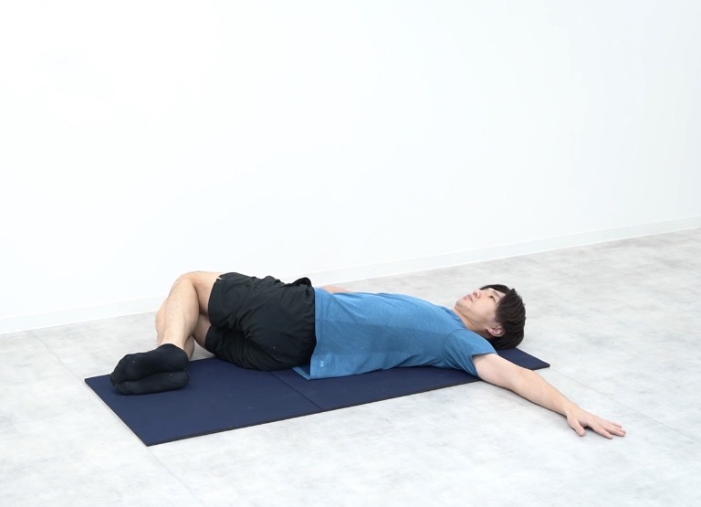 膝を曲げて閉じたまま、肩が浮かないように気をつけて、片側へ倒します