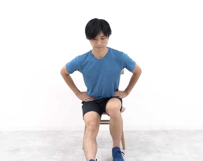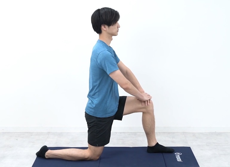 片膝立ちになり、後ろ側の膝が床から離れないように前側の足に体重を乗せていきます