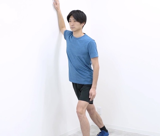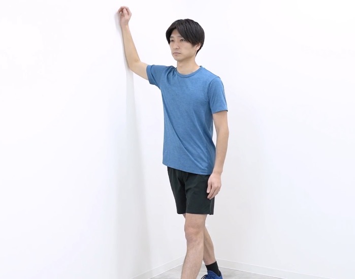 壁に肘を曲げて前腕をつけます
