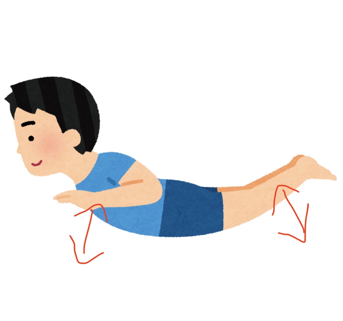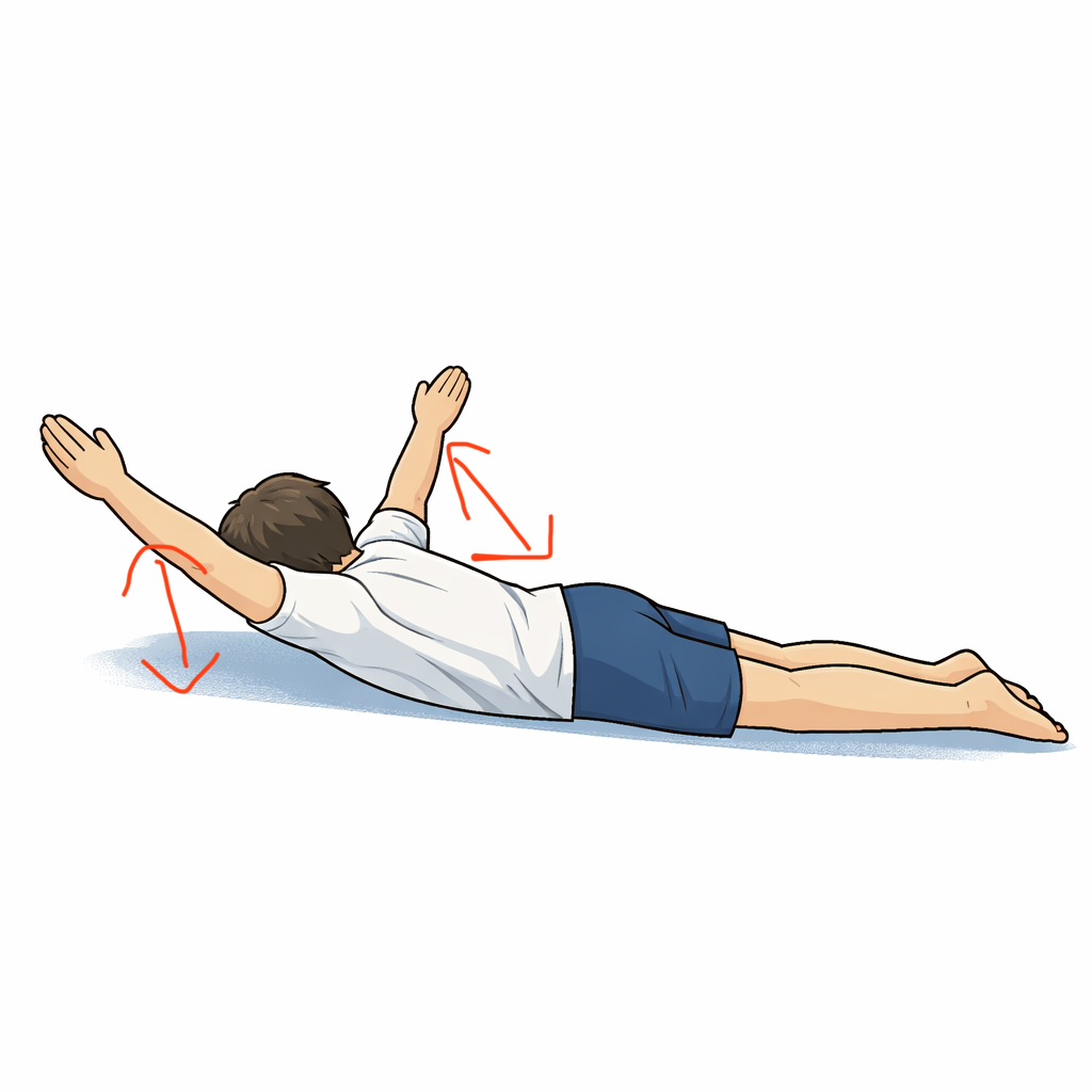 →うつ伏せで、手と足を同時に床からゆっくり浮かせて上半身を少し起こす