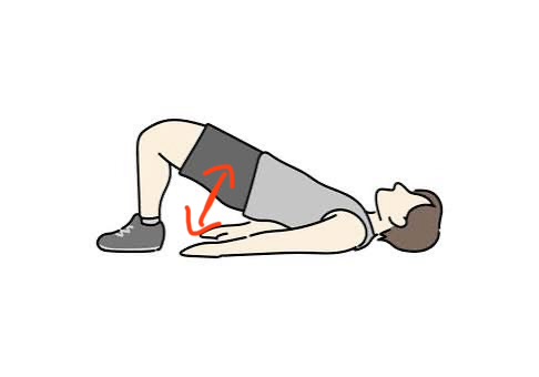 →仰向けで膝を90度曲げて寝て、太ももと一直線のなるまでゆっくりお尻を浮かせていく